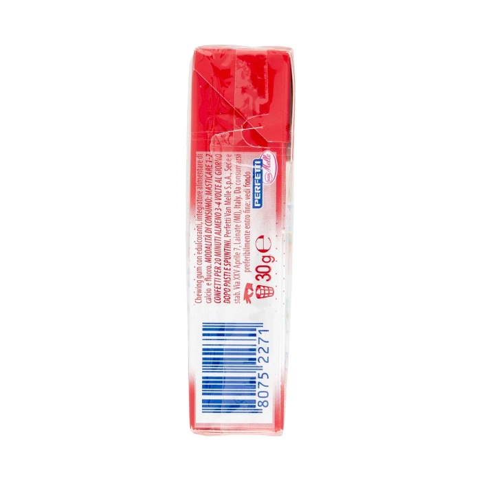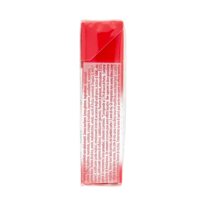 Edulcoranti (xilitolo (20%), maltitolo, mannitolo, sorbitolo, sciroppo di maltitolo, aspartame, acesulfame K, sucralosio), Gomma base, Fosfato dicalcico, Aromi, Maltodestrina, Amido, Succhi di frutta concentrati (fragola (0,48%)*, limone), Acidificante (acido malico), Emulsionanti (esteri di saccarosio degli acidi grassi, lecitine di soia), Olio di cocco, Addensante (gomma di cellulosa), Stabilizzante (glicerolo), Fluoruro di potassio, Antiossidante (E321), Agente di rivestimento (cera carnauba), Colorante (carminio), *Corrisponde al 3,5% di succo di frutta, Contiene una fonte di fenilalanina