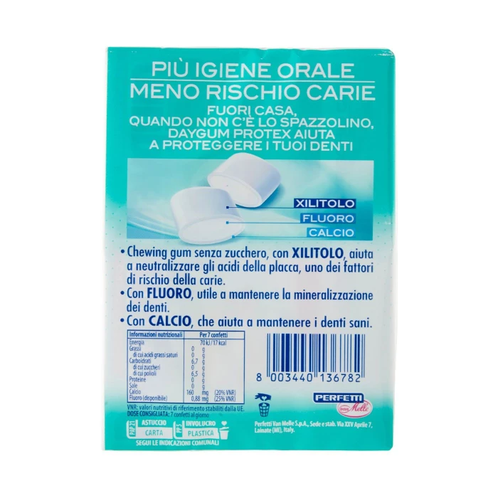 Per 100 g di prodotto - Per 7 confetti : Energia : 70 kJ / 17 kcal, Grassi : 0 g, di cui acidi grassi saturi : 0 g, Carboidrati : 6,7 g, di cui zuccheri : 0 g, di cui polioli : 6,5 g, Proteine : 0 g, Sale : 0 g, Calcio : 160 mg, Fluoro (disponibile): 0,88 mg, VNR: valori nutritivi di riferimento stabiliti dalla UE VNR: Energia , Grassi , di cui acidi grassi saturi , Carboidrati , di cui zuccheri , di cui polioli , Proteine , Sale , Calcio : 20%, Fluoro (disponibile): 25%, VNR: valori nutritivi di riferimento stabiliti dalla UE