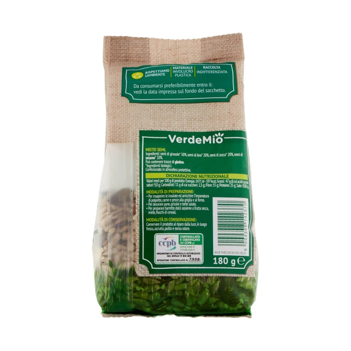 Semi di girasole* 50%, Semi di lino* 20%, Semi di zucca* 20%, Semi di sesamo* 10%, Può contenere tracce di glutine, *Ingredienti biologici
