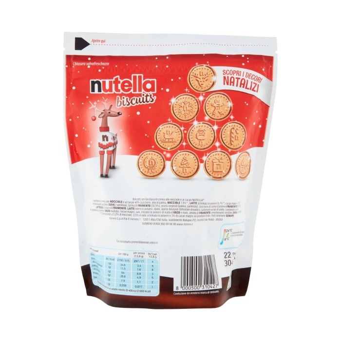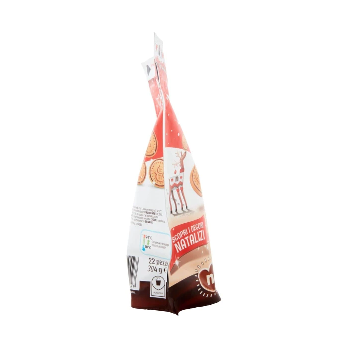 Per 100 g di prodotto - per 100 g: Energia: 2158 kJ/515 kcal, Grassi: 24,8 g, di cui acidi grassi saturi: 11,5 g, Carboidrati: 64 g, di cui zuccheri: 35,8 g, Proteine: 7,9 g, Sale: 0,559 g, *Assunzioni di riferimento di un adulto medio (8 400 kJ/2 000 kcal) per pezzo (13,8 g): Energia: 297 kJ/71 kcal, Grassi: 3,4 g, di cui acidi grassi saturi: 1,6 g, Carboidrati: 8,8 g, di cui zuccheri: 4,9 g, Proteine: 1,1 g, Sale: 0,077 g, *Assunzioni di riferimento di un adulto medio (8 400 kJ/2 000 kcal) (%*) per 13,8 g: Energia: 4, Grassi: 5, di cui acidi grassi saturi: 8, Carboidrati: 3, di cui zuccheri: 5, Proteine: 2, Sale: 1, *Assunzioni di riferimento di un adulto medio (8 400 kJ/2 000 kcal)