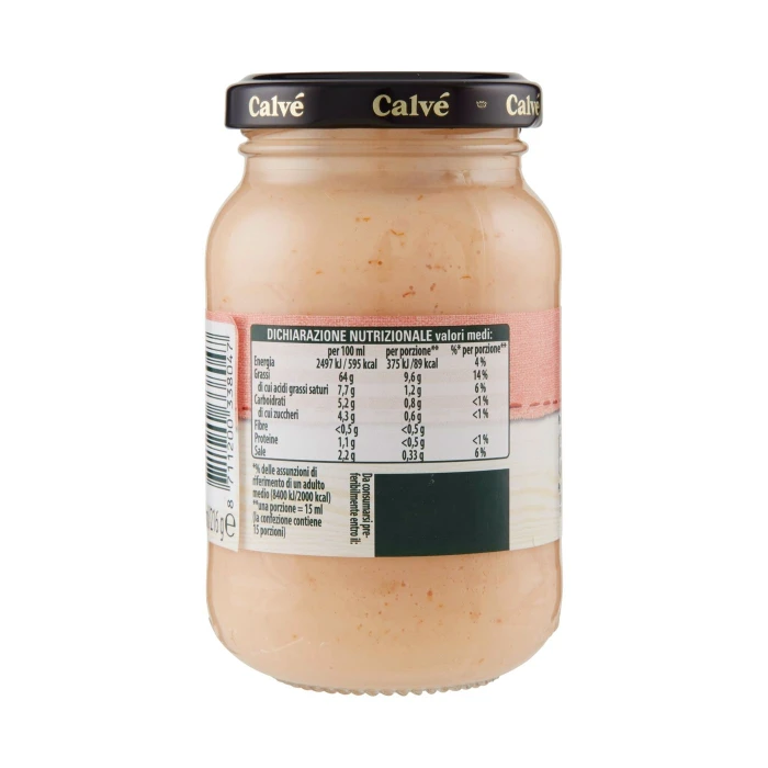 Per 100 g di prodotto - per 100 ml: Energia : 2497 kJ / 595 kcal, Grassi : 64 g, di cui acidi grassi saturi : 7,7 g, Carboidrati : 5,2 g, di cui zuccheri : 4,3 g, Fibre : <0,5 g, Proteine : 1,1 g, Sale : 2,2 g, *% delle assunzioni di riferimento di un adulto medio (8400 kJ/2000 kcal), **una porzione = 15 ml (la confezione contiene 15 porzioni) per porzione**: Energia : 375 kJ / 89 kcal, Grassi : 9,6 g, di cui acidi grassi saturi : 1,2 g, Carboidrati : 0,8 g, di cui zuccheri : 0,6 g, Fibre : <0,5 g, Proteine : <0,5 g, Sale : 0,33 g, *% delle assunzioni di riferimento di un adulto medio (8400 kJ/2000 kcal), **una porzione = 15 ml (la confezione contiene 15 porzioni) %* per porzione**: Energia : 4%, Grassi : 14%, di cui acidi grassi saturi : 6%, Carboidrati : <1%, di cui zuccheri : <1%, Fibre , Proteine : <1%, Sale : 6%, *% delle assunzioni di riferimento di un adulto medio (8400 kJ/2000 kcal), **una porzione = 15 ml (la confezione contiene 15 porzioni)
