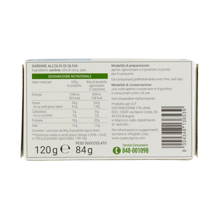 Per 100 g di prodotto - Energia: 1348 kJ: 323 kcal, Grassi: 28 g, - di cui acidi grassi saturi: 4,2 g, Carboidrati: 0 g, - di cui zuccheri: 0 g, Proteine: 18 g, Sale: 1,0 g, Contiene 1 porzione da 84 g di prodotto sgocciolato
