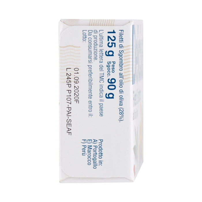 Per 100 g di prodotto - Valori nutrizionali medi per 100 g di prodotto sgocciolato: Energia : 988 kJ - 237 kcal, Grassi : 16,0 g, di cui acidi grassi saturi : 3,2 g, di cui acidi grassi monoinsaturi : 9,2 g, di cui acidi grassi polinsaturi*: 2,8 g, Carboidrati : 0,0 g, di cui zuccheri : 0,0 g, Proteine : 23,3 g, Sale : 0,96 g, *Omega 3 1,2 g (EPA+DHA 867 mg)