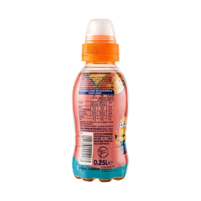 Acqua minerale naturale (80%), Zucchero, Aromi, Acidificante: acido citrico, Estratto di thè deteinato, Succo di pesca (0,1%) da concentrato, Antiossidante: acido ascorbico, Caffeina inferiore a 1 mg per litro, Senza glutine
