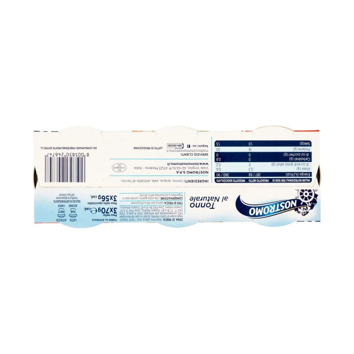 Per 100 g di prodotto - Valori nutrizionali per 100g di prodotto netto: Energia : 287 kJ / 68 Kcal, Grassi : 0,3 g, di cui acidi grassi saturi : 0 g, Carboidrati : 0 g, di cui zuccheri : 0 g, Proteine : 16 g, Sale : 1,0 g Prodotto sgocciolato: Energia : 380 kJ / 90 Kcal, Grassi : 0,6 g, di cui acidi grassi saturi : 0,2 g, Carboidrati : 0,8 g, di cui zuccheri : 0 g, Proteine : 20 g, Sale : 1,5 g