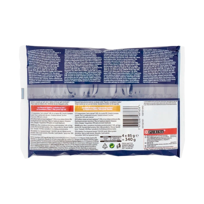 Per 100 g di prodotto - con Manzo in Gelatina Componenti analitici / Additivi:: Componenti analitici: , Umidità: : 82%, Proteina: : 11,5%, Grassi grezzi: : 2,5%, Ceneri grezze: : 2,5%, Fibra grezza: : 0,05%, Acidi grassi Omega-6: : 0,4%, Additivi: , Additivi nutrizionali: : Ul/kg:, Vit A: : 655, Vit D₃: : 100, Vit E: : 15, : mg/kg:, 3b103: : (Fe: 7,6), 3b202: : (I: 0,19), 3b405: : (Cu: 0,66), 3b503: : (Mn: 1,5), 3b605: : (Zn: 13), 3a370: : 413, Aromatizzanti con Pollo in Gelatina Componenti analitici / Additivi:: Componenti analitici: , Umidità: 82%, Proteina: : 11,5%, Grassi grezzi: : 2,5%, Ceneri grezze: : 2,5%, Fibra grezza: : 0,05%, Acidi grassi Omega-6: : 0,4%, Additivi: , Additivi nutrizionali: : UI/kg:, Vit A: : 655, Vit D₃: : 100, Vit E: : 15, : mg/kg:, 3b103: : (Fe: 7,6), 3b202: : (I: 0,19), 3b405: : (Cu: 0,66), 3b503: : (Mn: 1,5), 3b605: : (Zn: 13), 3a370: : 413, Aromatizzanti