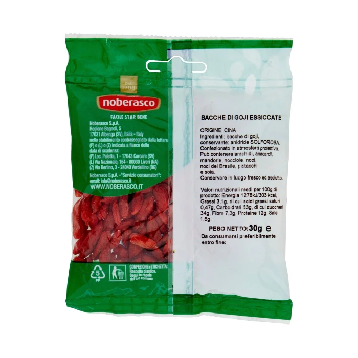 Bacche di goji, Conservante: anidride solforosa, Può contenere arachidi, anacardi, mandorle, nocciole, noci, noci del Brasile, pistacchi e soia
