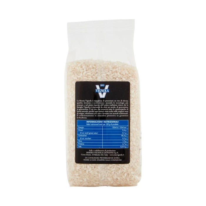 Per 100 g di prodotto - Valori nutrizinali medi per 100 g di prodotto:: Energia : 1504 kJ / 354 kcal, Grassi : 0,4 g, di cui: acidi grassi saturi : 0,1 g, Carboidrati : 80,4 g, di cui: zuccheri : 0,2 g, Fibre : 1,0 g, Proteine : 6,7 g, Sale : 0,013 g