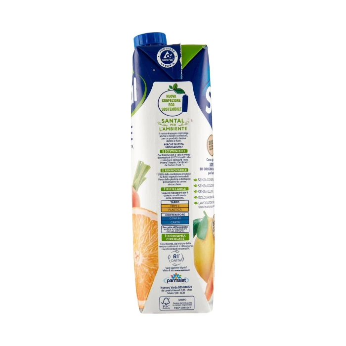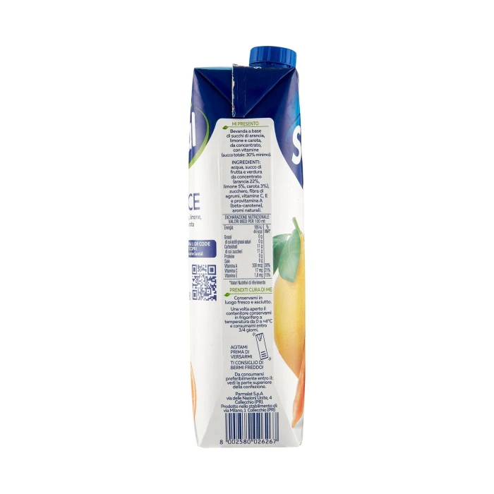 Acqua, Succo di frutta e verdura da concentrato (arancia 22%, limone 5%, carota 3%), Zucchero, Fibra di agrumi, Vitamine C, E e provitamina A (beta-carotene), Aromi naturali