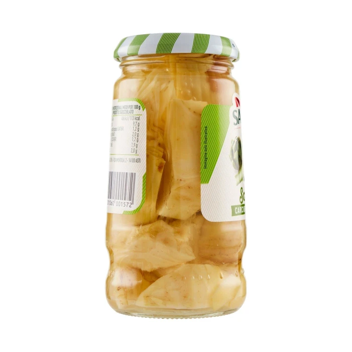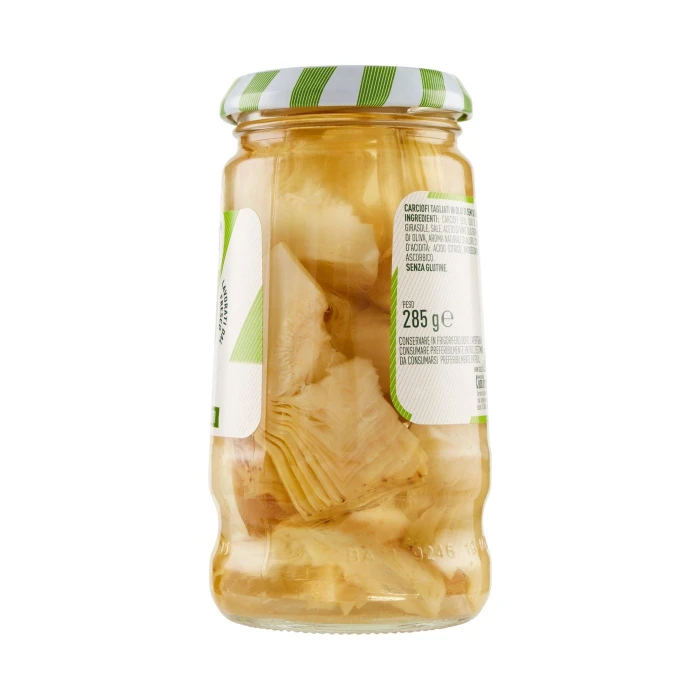 Carciofi 55%, Olio di semi di girasole, Sale, Aceto di vino, Olio extra vergine di oliva, Aroma naturale di alloro, Correttore d'acidità: acido citrico, Antiossidante: acido ascorbico, Senza glutine