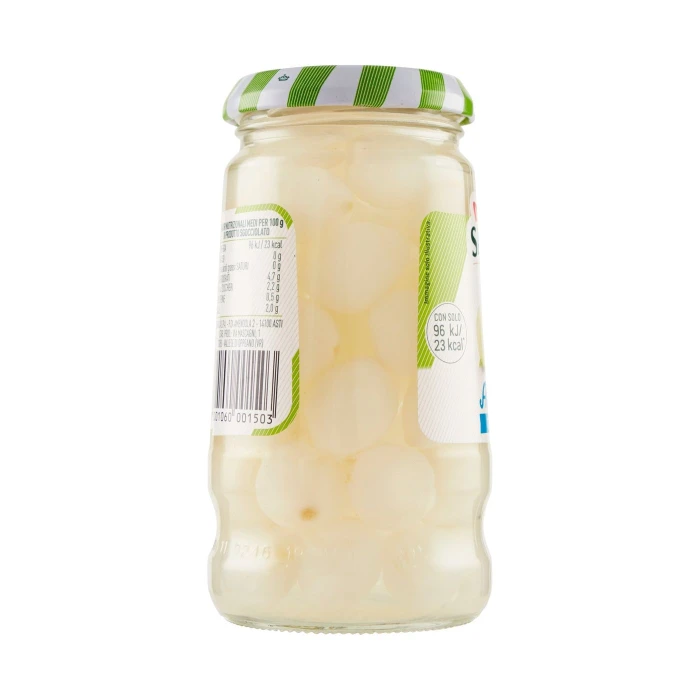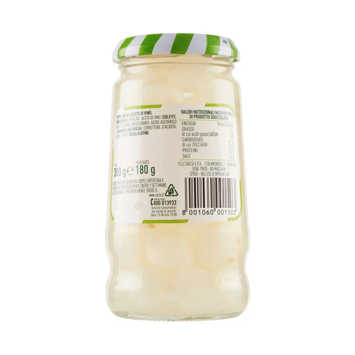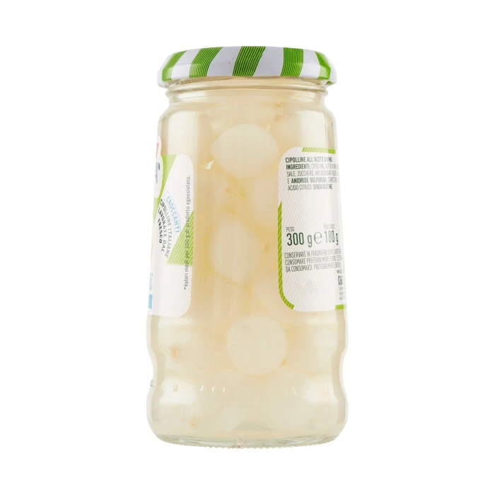 Cipolline, Aceto di vino (solfiti), Sale, Zucchero, Antiossidanti: acido ascorbico e anidride solforosa, Correttore d'acidità: acido citrico, Senza glutine