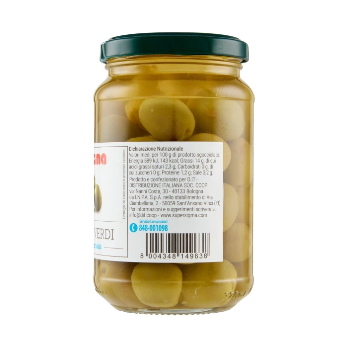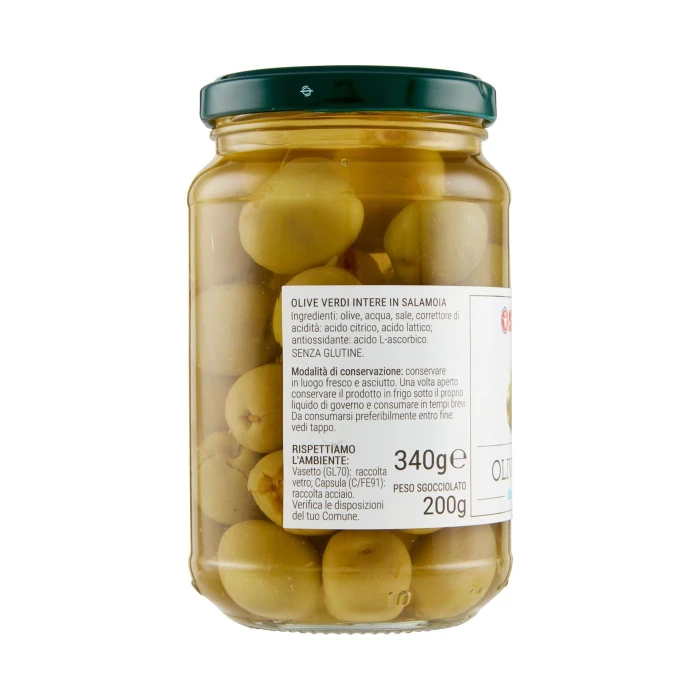 Olive, Acqua, Sale, Correttore di acidità: acido citrico, acido lattico, Antiossidante: acido L-ascorbico, Senza glutine