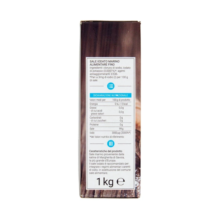 Per 100 g di prodotto - Energia: 0 kJ / 0 kcal, Grassi: 0,0 g, - di cui acidi grassi saturi: 0,0 g, Carboidrati: 0 g, - di cui zuccheri: 0 g, Proteine: 0 g, Sale: 99 g, Iodio: 3000 µg, *dei Valori nutritivi di riferimento