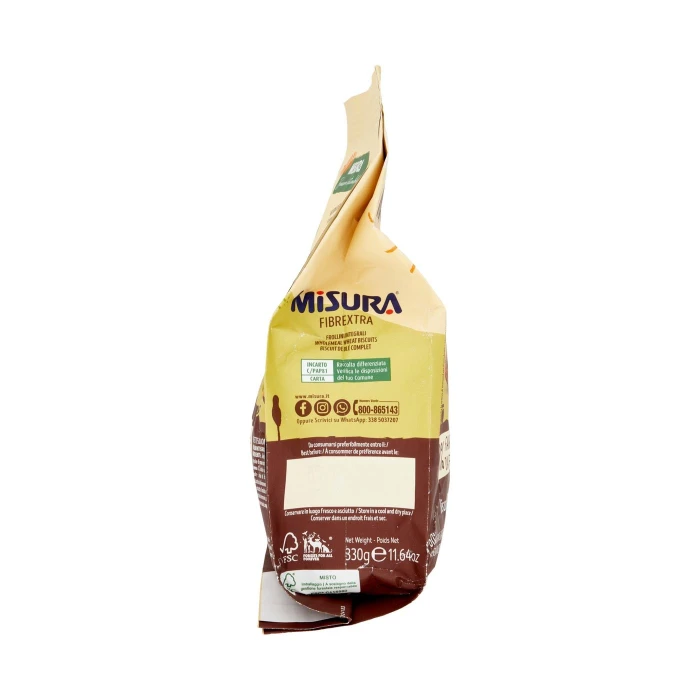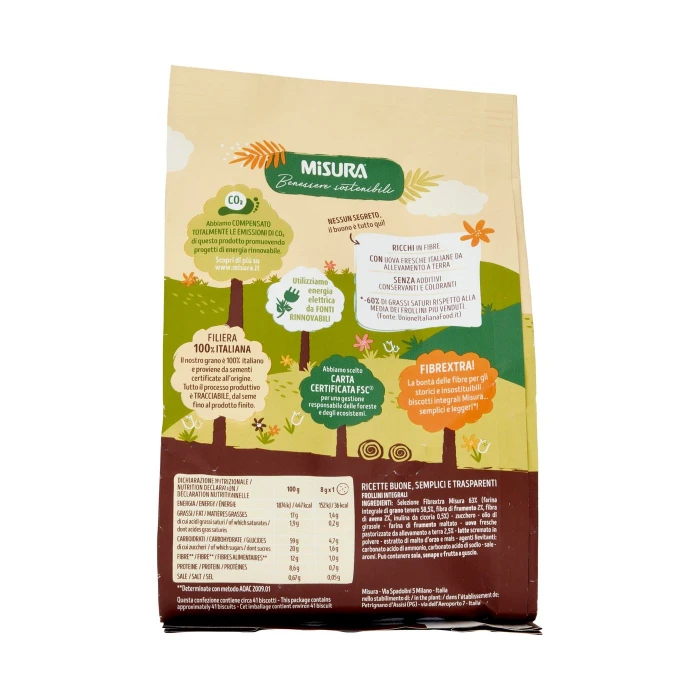 Selezione Fibrextra Misura 63% (farina integrale di grano tenero 58,5%, fibra di frumento 2%, fibra di avena 2%, inulina da cicoria 0,5%), Zucchero, Olio di girasole, Farina di frumento maltato, Uova fresche pastorizzate da allevamento a terra 2,5%, Latte scremato in polvere, Estratto di malto d'orzo e mais, Agenti lievitanti: carbonato acido di ammonio, carbonato acido di sodio, Sale, Aromi, Può contenere soia, senape e frutta a guscio