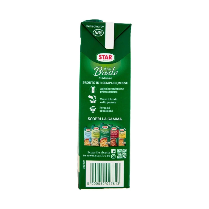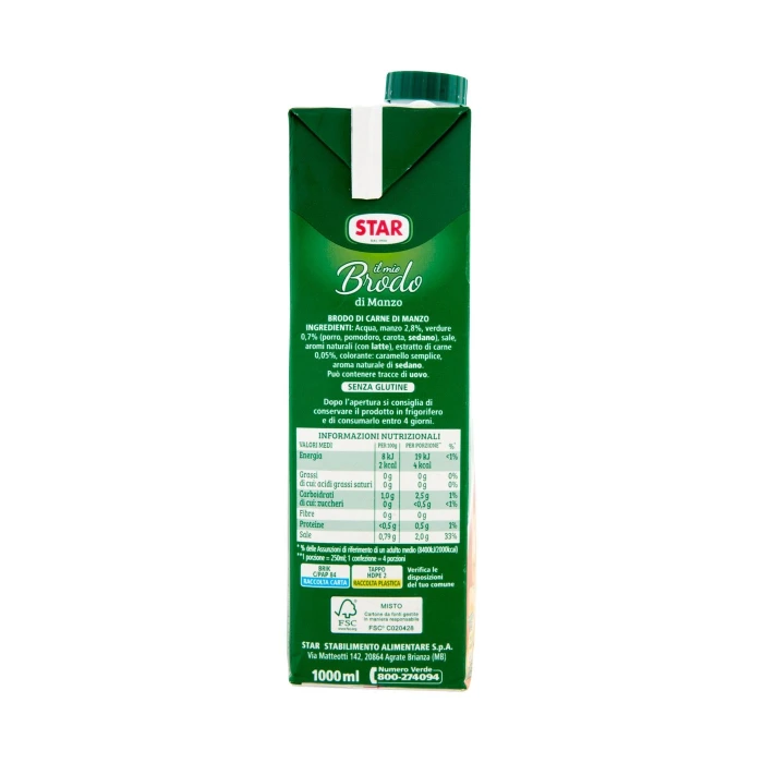 Acqua, Manzo 2,8%, Verdure 0,7% (porro, pomodoro, carota, sedano), Sale, Aromi naturali (con latte), Estratto di carne 0,05%, Colorante: caramello semplice, Aroma naturale di sedano, Può contenere tracce di uovo, Senza glutine
