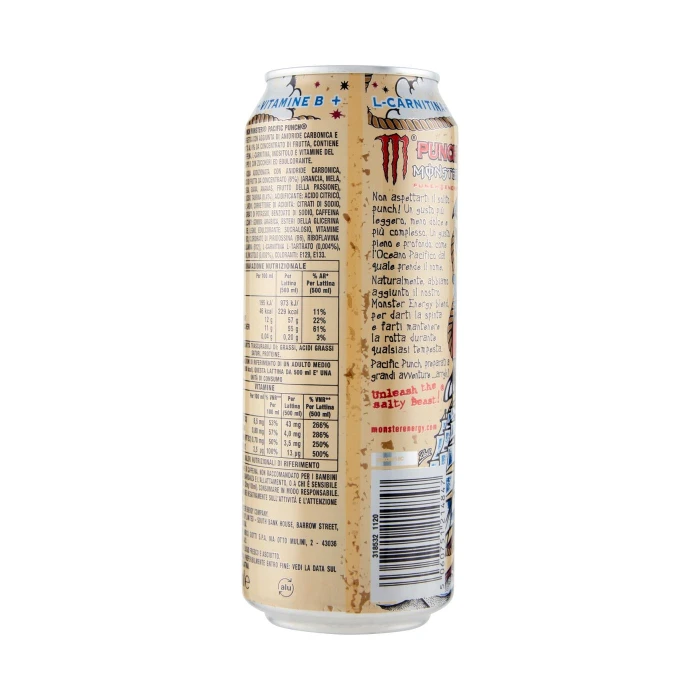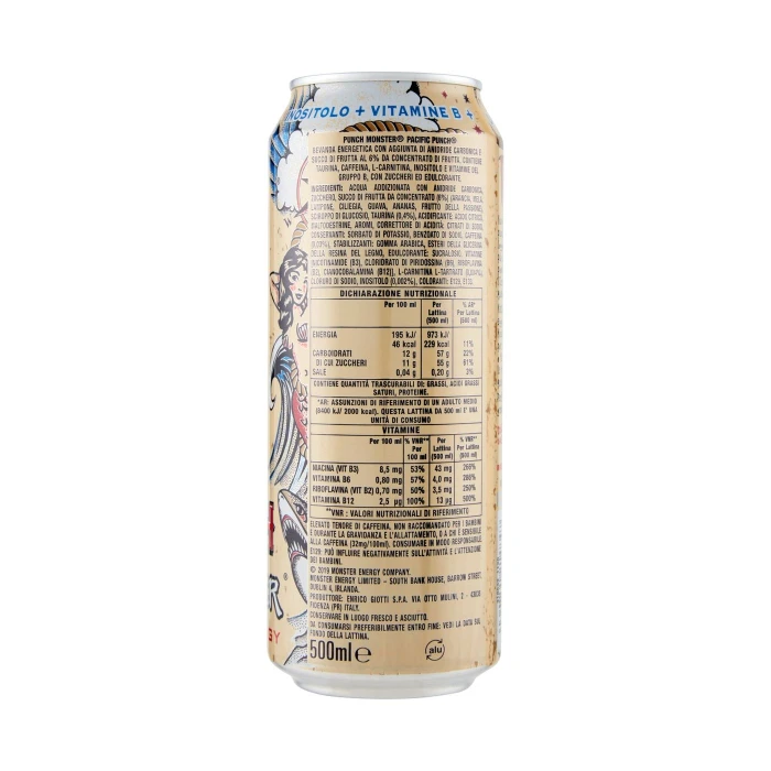 Per 100 g di prodotto - Per 100 ml : Energia : 195 kJ/, : 46 kcal, Carboidrati : 12 g, di cui zuccheri : 11 g, Sale : 0,04 g, Contiene quantità trascurabili di: grassi, acidi grassi saturi, proteine , *AR: assunzioni di riferimento di un adulto medio (8400 kJ/ 2000 kcal) , Questa lattina da 500 ml è una unità di consumo, Vitamine, Niacina (Vit B3): 8,5 mg, Vitamina B6 : 0,80 mg, Riboflavina (Vit B2) : 0,70 mg, Vitamina B12 : 2,5 µg, **VNR: valori nutrizionali di riferimento % VNR** Per 100 ml : Energia , , Carboidrati , di cui zuccheri , Sale , Contiene quantità trascurabili di: grassi, acidi grassi saturi, proteine , *AR: assunzioni di riferimento di un adulto medio (8400 kJ/ 2000 kcal) , Questa lattina da 500 ml è una unità di consumo, Vitamine, Niacina (Vit B3): 53%, Vitamina B6 : 57%, Riboflavina (Vit B2) : 50%, Vitamina B12 : 100%, **VNR: valori nutrizionali di riferimento Per Lattina (500 ml) : Energia : 973 kJ/, : 229 kcal, Carboidrati : 57 g, di cui zuccheri : 55 g, Sale : 0,20 g, Contiene quantità trascurabili di: grassi, acidi grassi saturi, proteine , *AR: assunzioni di riferimento di un adulto medio (8400 kJ/ 2000 kcal) , Questa lattina da 500 ml è una unità di consumo, Vitamine, Niacina (Vit B3): 43 mg, Vitamina B6 : 4,0 mg, Riboflavina (Vit B2) : 3,5 mg, Vitamina B12 : 13 µg, **VNR: valori nutrizionali di riferimento % VNR** Per Lattina (500 ml): Energia , , Carboidrati , di cui zuccheri , Sale , Contiene quantità trascurabili di: grassi, acidi grassi saturi, proteine , *AR: assunzioni di riferimento di un adulto medio (8400 kJ/ 2000 kcal) , Questa lattina da 500 ml è una unità di consumo, Vitamine, Niacina (Vit B3): 266%, Vitamina B6 : 286%, Riboflavina (Vit B2) : 250%, Vitamina B12 : 500%, **VNR: valori nutrizionali di riferimento % AR* Per Lattina (500 ml): Energia , : 11%, Carboidrati : 22%, di cui zuccheri : 61%, Sale : 3%, Contiene quantità trascurabili di: grassi, acidi grassi saturi, proteine , *AR: assunzioni di riferimento di un adulto medio (8400 kJ/ 2000 kcal) , Questa lattina da 500 ml è una unità di consumo, Vitamine, Niacina (Vit B3), Vitamina B6 , Riboflavina (Vit B2) , Vitamina B12 , **VNR: valori nutrizionali di riferimento