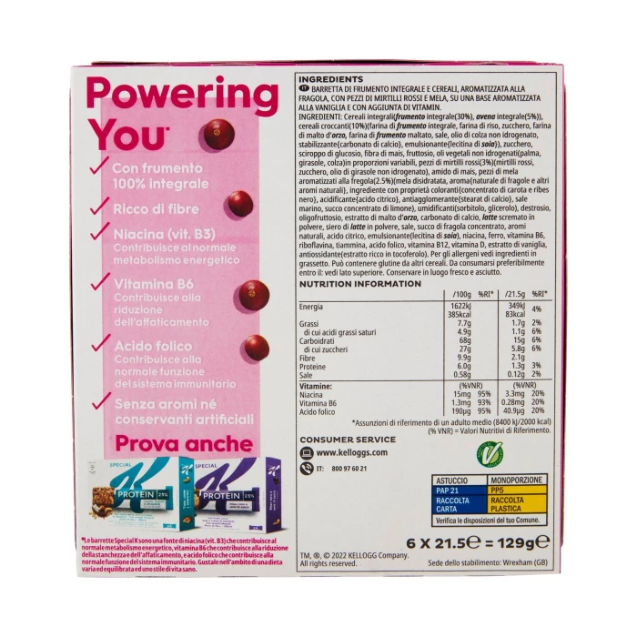 Cereali integrali (frumento integrale (30%), avena integrale (5%)) , Cereali croccanti (10%) (farina di frumento integrale, farina di riso, zucchero, farina di malto d'orzo, farina di frumento maltato, sale, olio di colza non idrogenato, stabilizzante {carbonato di calcio}, emulsionante {lecitina di soia}), Zucchero, Sciroppo di glucosio, Fibra di mais, Fruttosio, Oli vegetali non idrogenati (palma, girasole, colza) in proporzioni variabili, Pezzi di mirtilli rossi (3%) (mirtilli rossi, zucchero, olio di girasole non idrogenato), Amido di mais, Pezzi di mela aromatizzati alla fragola (2.5%) (mela disidratata, aroma {naturale di fragole e altri aromi naturali}, ingrediente con proprietà coloranti {concentrato di carota e ribes nero}, acidificante {acido citrico}, antiagglomerante {stearato di calcio}, sale marino, succo concentrato di limone), Umidificanti (sorbitolo, glicerolo), Destrosio, Oligofruttosio, Estratto di malto d'orzo, Carbonato di calcio, Latte scremato in polvere, Siero di latte in polvere, Sale, Succo di fragola concentrato, Aromi naturali, Acido citrico, Emulsionante (lecitina di soia), Niacina, Ferro, Vitamina B6, Riboflavina, Tiammina, Acido folico, Vitamina B12, Vitamina D, Estratto di vaniglia, Antiossidante (estratto ricco in tocoferolo), Può contenere glutine da altri cereali