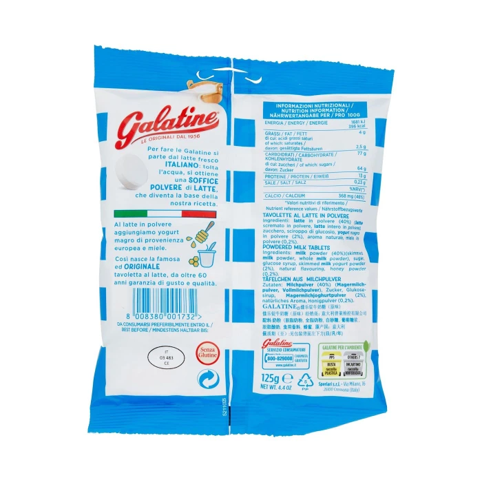 Latte in polvere (40%) (latte scremato in polvere, latte intero in polvere), Zucchero, Sciroppo di glucosio, Yogurt magro in polvere (2%), Aroma naturale, Miele in polvere (0,2%)