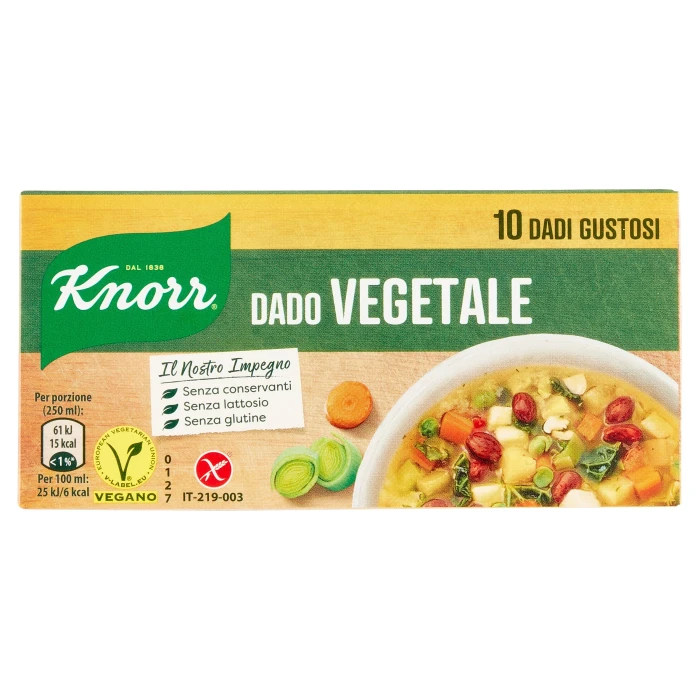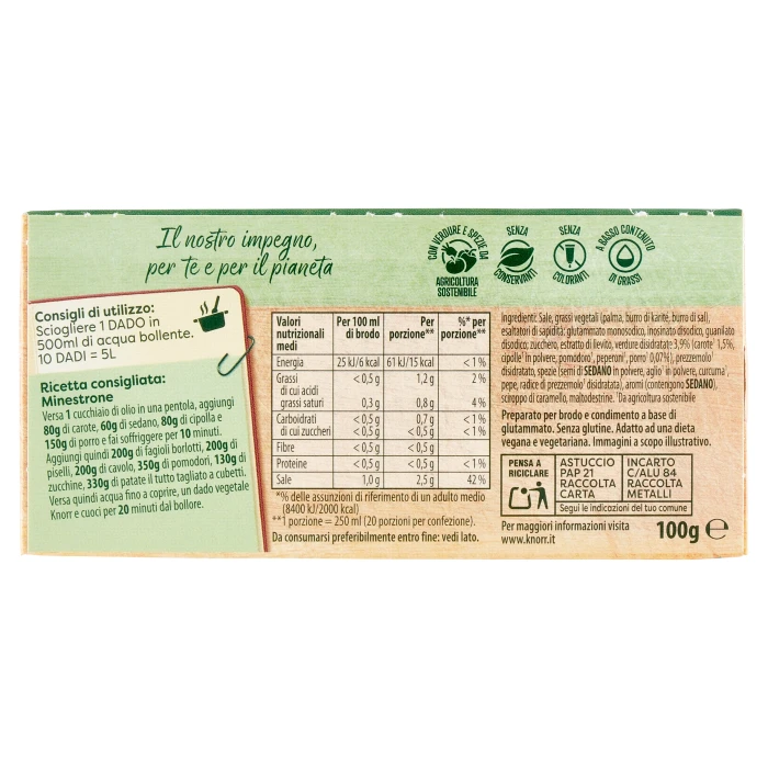 Sale, Grassi vegetali (palma, burro di karité, burro di sal), Esaltatori di sapidità: glutammato monosodico, inosinato disodico, guanilato disodico, Zucchero, Estratto di lievito, Verdure disidratate 3,9% (carote¹ 1,5%, cipolle¹ in polvere, pomodoro¹, peperoni¹, porro¹ 0,07%), Prezzemolo¹ disidratato, Spezie (semi di sedano in polvere, aglio¹ in polvere, curcuma¹, pepe, radice di prezzemolo¹ disidratata), Aromi (contengono sedano), Sciroppo di caramello, Maltodestrine, ¹Da agricoltura sostenibile
