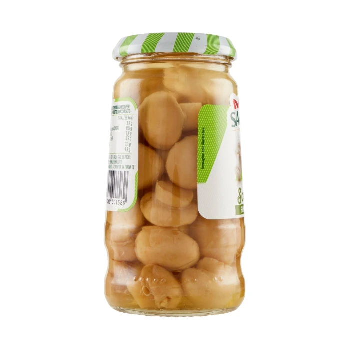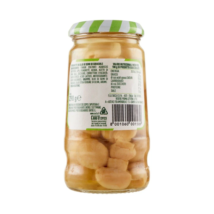 Funghi coltivati Agaricus bisporus 62% (funghetti, acqua, aceto di vino, sale, zucchero, correttori d'acidità: acido citrico, acido lattico, antiossidante: acido ascorbico, solfiti), Olio di semi di girasole, Olio extra vergine di oliva, Aromi, Senza glutine