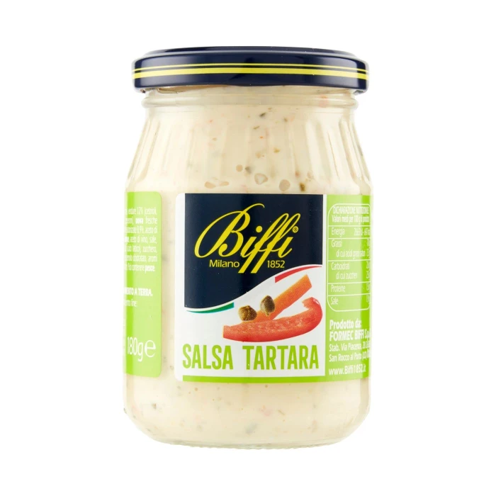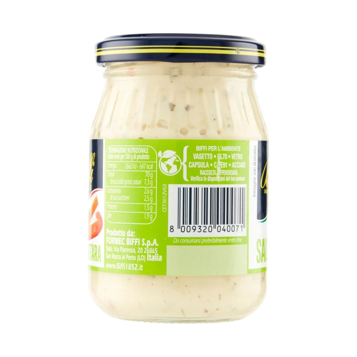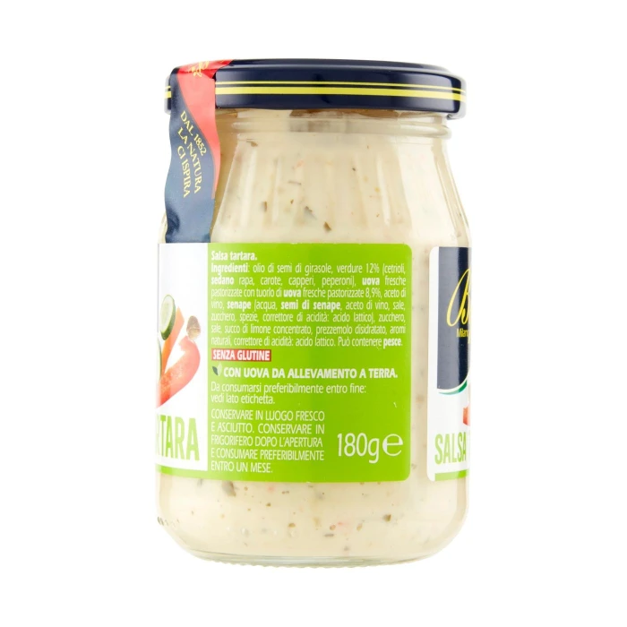 Olio di semi di girasole, Verdure 12% (cetrioli, sedano rapa, carote, capperi, peperoni), Uova fresche pastorizzate con tuorlo di uova fresche pastorizzate 8,9%, Aceto di vino, Senape (acqua, semi di senape, aceto di vino, sale, zucchero, spezie, correttore di acidità: acido lattico), Zucchero, Sale, Succo di limone concentrato, Prezzemolo disidratato, Aromi naturali, Correttore di acidità: acido lattico, Può contenere pesce, Senza glutine
