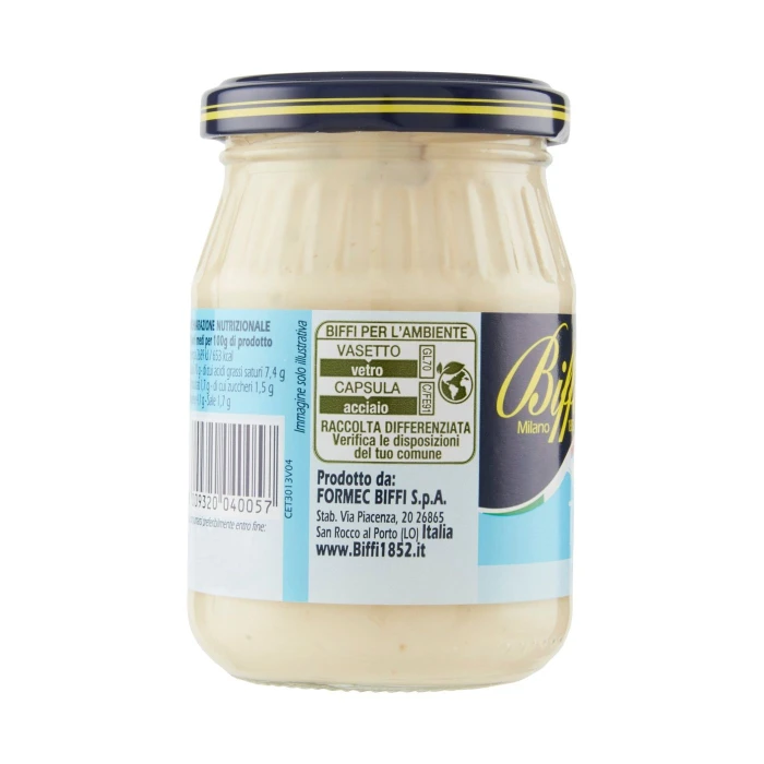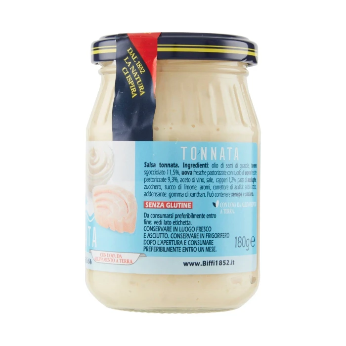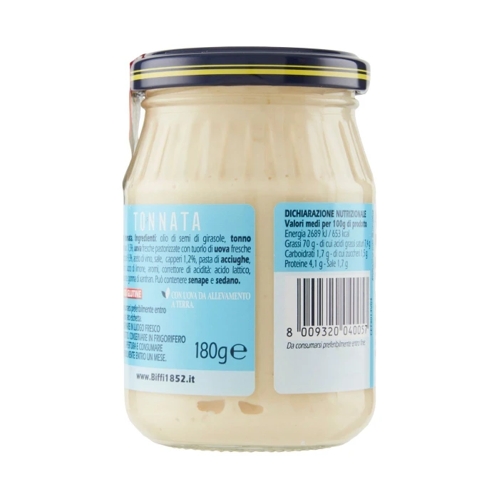 Olio di semi di girasole, Tonno sgocciolato 11,5%, Uova fresche pastorizzate con tuorlo di uova fresche pastorizzate 9,3%, Aceto di vino, Sale, Capperi 1,2%, Pasta di acciughe, Zucchero, Succo di limone, Aromi, Correttore di acidità: acido lattico, Addensante: gomma di xanthan, Può contenere senape e sedano, Senza glutine
