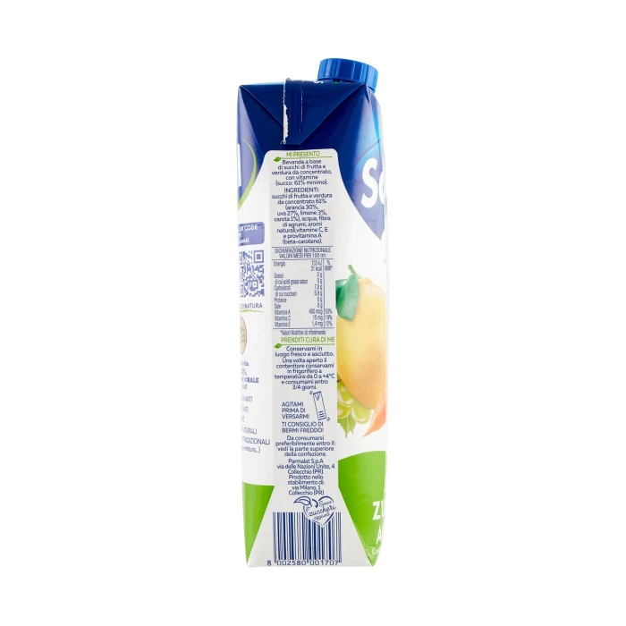 Succhi di frutta e verdura da concentrato 61% (arancia 30%, uva 27%, limone 3%, carota 1%), Acqua, Fibra di agrumi, Aromi naturali, Vitamine C, E e provitamina A (beta-carotene)