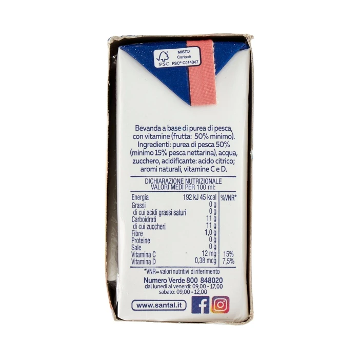Purea di pesca 50% (minimo 15% pesca nettarina), Acqua, Zucchero, Acidificante: acido citrico, Aromi naturali, Vitamine C e D