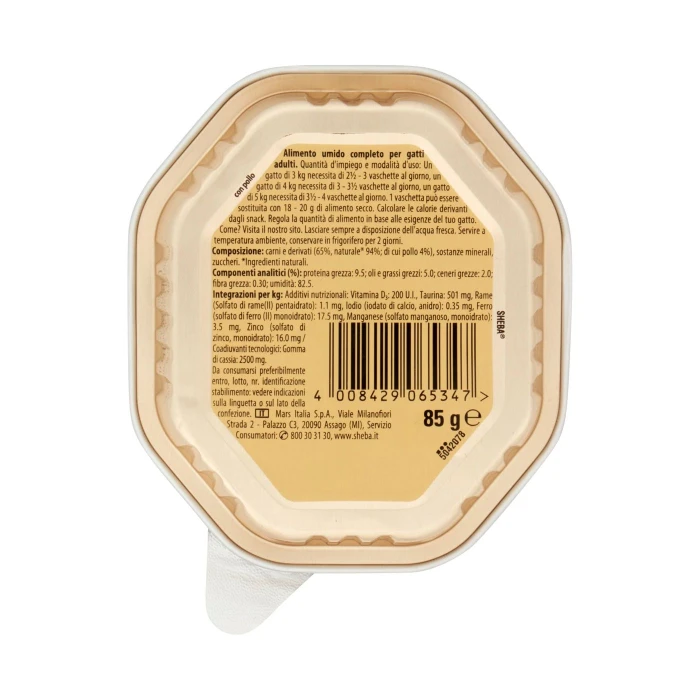 Per 100 g di prodotto - %: Componenti analitici (%): , proteina grezza: : 9.5, oli e grassi grezzi: : 5.0, ceneri grezze: : 2.0, fibra grezza: : 0.30, umidità: : 82.5, Integrazioni per kg: , Additivi nutrizionali: , Vitamina D₃: : 200 U.I., Taurina: : 501 mg, Rame (Solfato di rame(II) pentaidrato): : 1.1 mg, Iodio (iodato di calcio, anidro): : 0.35 mg, Ferro (solfato di ferro (II) monoidrato): : 17.5 mg, Manganese (solfato manganoso, monoidrato): : 3.5 mg, Zinco (solfato di zinco, monoidrato): : 16.0 mg, Coadiuvanti tecnologici: , Gomma di cassia: : 2500 mg
