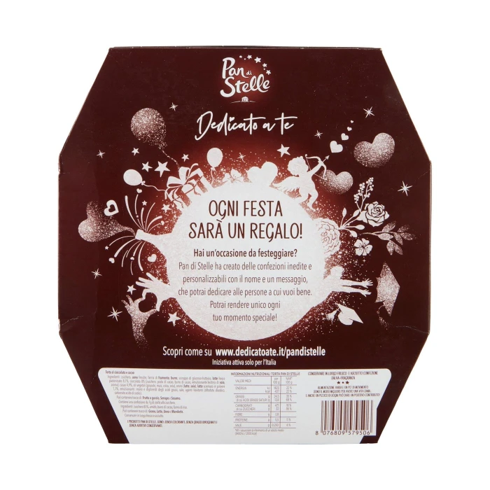 Zucchero, Uova fresche, Farina di frumento, Burro, Sciroppo di glucosio-fruttosio, Latte fresco pastorizzato 8,7%, Cioccolato 8% (zucchero, pasta di cacao, burro di cacao, emulsionante: lecitina di soia, aroma), Cacao 4,9%, Oli vegetali (girasole, mais, colza, soia), Aromi (latte, soia), Latte scremato in polvere 1,1%, Emulsionanti: mono e digliceridi degli acidi grassi, Sale, Agenti lievitanti (difosfato disodico, carbonato acido di sodio), Può contenere tracce di: frutta a guscio, senape e sesamo, Contiene una confezione da 7g di stelle allo zucchero. Ingredienti: zucchero 85%, amido, burro di cacao, farina di riso. Può contenere tracce di: grano, latte, uova e mandorle