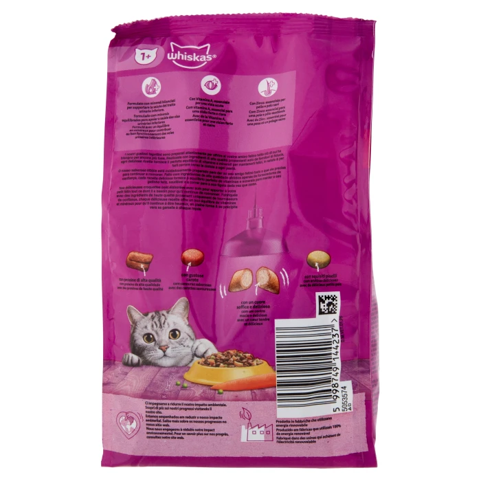 Composizione:, Cereali, Carni e derivati (di cui 4% pollo nelle crocchette marroni*), Oli e grassi, Estratti di proteine vegetali, Sottoprodotti di origine vegetale, Sostanze minerali, Verdure (di cui 0.5% carote essiccate (equivalente a 4% di carote) nelle crocchette arancioni e 1% piselli essiccati (equivalente a 4% di piselli) nelle crocchette verdi*), Zuccheri, Lieviti, *Crocchette marroni solitamente il 70% del prodotto, crocchette arancioni e crocchette verdi solitamente l'8% di prodotto ciascuna