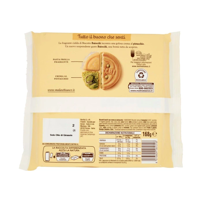 Mulino Bianco Baiocchi Biscotti Snack Farciti con Crema al Pistacchio 168g