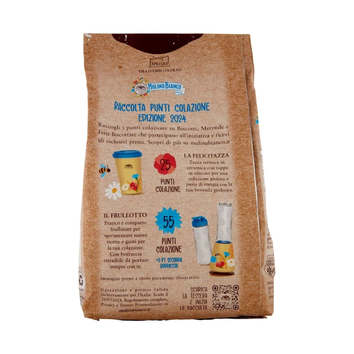 Farina integrale di frumento 29,1%*, Farina di frumento 27%*, Zucchero, Burro, Olio di girasole, Uova fresche, Cioccolato 3,3%* (zucchero, pasta di cacao, cacao magro, aroma), Cacao 2,3%*, Fibra di frumento, Miele, Latte scremato in polvere, Sale, Agenti lievitanti (carbonato acido d'ammonio, carbonato acido di sodio), Aromi, *Percentuali espresse sul prodotto finito, Può contenere tracce di frutta a guscio, senape, sesamo e soia