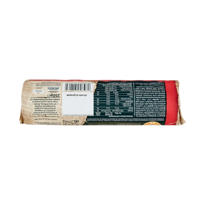 Per 100 g di prodotto - Per 100 g: Energia : 1952 kJ/466 kcal, Grassi : 19,7 g, - di cui: acidi grassi saturi : 2,1 g, Carboidrati : 60,4 g, - di cui: zuccheri : 19,2 g, Fibre : 7,5 g, Proteine : 8,0 g, Sale : 0,875 g, Fosforo per 100 g: 230 mg, Ferro per 100 g: 2,1 mg, Magnesio per 100 g: 62 mg, ¹AR = assunzioni di riferimento di un adulto medio (8400 kJ / 2000 kcal), ²VNR = Valori nutritivi di riferimento, La confezione contiene circa 22 biscotti VNR² : Energia , Grassi , - di cui: acidi grassi saturi , Carboidrati , - di cui: zuccheri , Fibre , Proteine , Sale , Fosforo per 100 g: 33%, Ferro per 100 g: 15%, Magnesio per 100 g: 17%, ¹AR = assunzioni di riferimento di un adulto medio (8400 kJ / 2000 kcal), ²VNR = Valori nutritivi di riferimento, La confezione contiene circa 22 biscotti Per biscotto (ca. 11,2 g): Energia : 219 kJ/52 kcal, Grassi : 2,2 g, - di cui: acidi grassi saturi : 0,2 g, Carboidrati : 6,8 g, - di cui: zuccheri : 2,2 g, Fibre : 0,8 g, Proteine : 0,9 g, Sale : 0,098 g, Fosforo per 100 g, Ferro per 100 g, Magnesio per 100 g, ¹AR = assunzioni di riferimento di un adulto medio (8400 kJ / 2000 kcal), ²VNR = Valori nutritivi di riferimento, La confezione contiene circa 22 biscotti %AR¹ per biscotto: Energia : 3%, Grassi : 3%, - di cui: acidi grassi saturi : 1%, Carboidrati : 3%, - di cui: zuccheri : 2%, Fibre , Proteine : 2%, Sale : 2%, Fosforo per 100 g, Ferro per 100 g, Magnesio per 100 g, ¹AR = assunzioni di riferimento di un adulto medio (8400 kJ / 2000 kcal), ²VNR = Valori nutritivi di riferimento, La confezione contiene circa 22 biscotti
