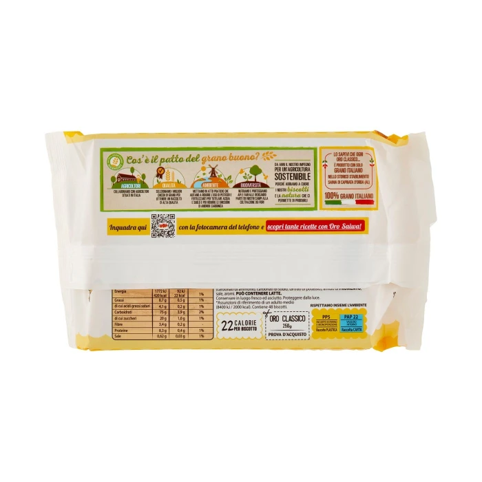 Per 100 g di prodotto - 100 g: Energia : 1772 kJ, : 420 kcal, Grassi : 8,7 g, di cui acidi grassi saturi : 4,1 g, Carboidrati : 75 g, di cui zuccheri : 20 g, Fibre : 3,4 g, Proteine : 8,3 g, Sale : 0,62 g, *Assunzioni di riferimento di un adulto medio (8400 kJ / 2000 kcal), Contiene 48 biscotti 1 biscotto (5,2 g): Energia : 92 kJ, : 22 kcal, Grassi : 0,5 g, di cui acidi grassi saturi : 0,2 g, Carboidrati : 3,9 g, di cui zuccheri : 1,0 g, Fibre : 0,2 g, Proteine : 0,4 g, Sale : 0,03 g, *Assunzioni di riferimento di un adulto medio (8400 kJ / 2000 kcal), Contiene 48 biscotti %* / 1 biscotto (5,2 g): Energia , : 1%, Grassi : 1%, di cui acidi grassi saturi : 1%, Carboidrati : 2%, di cui zuccheri : 1%, Fibre : -, Proteine : 1%, Sale : 1%, *Assunzioni di riferimento di un adulto medio (8400 kJ / 2000 kcal), Contiene 48 biscotti