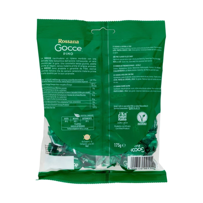 Sciroppo di glucosio, Zucchero, Aroma naturale di pino, Aromi, Può contenere latte, frutta a guscio e soia, Senza glutine