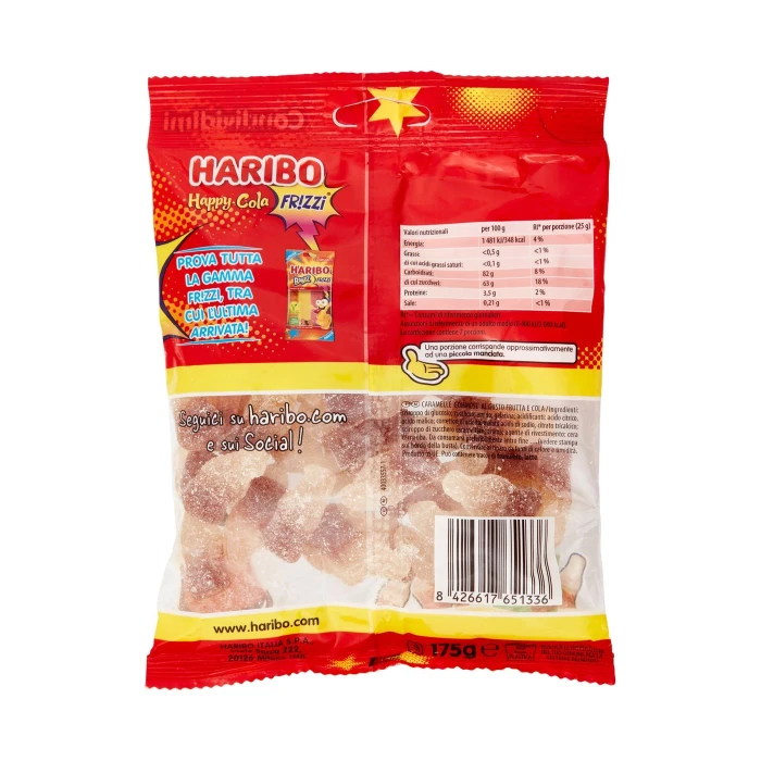 Sciroppo di glucosio, Zucchero, Amido, Gelatina, Acidificanti: acido citrico, acido malico, Correttori di acidità: malato acido di sodio, citrato tricalcico, Sciroppo di zucchero caramellato, Aroma, Agente di rivestimento: cera carnauba, Può contenere tracce di frumento, latte