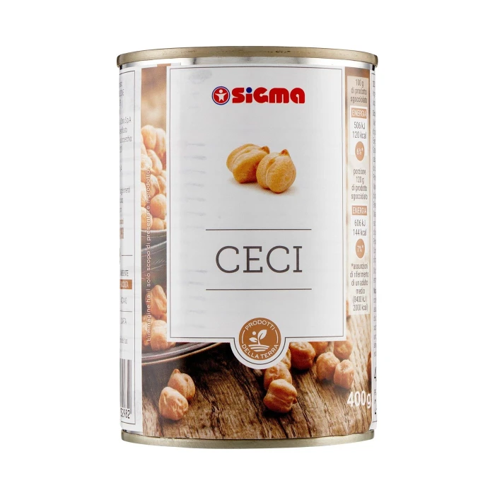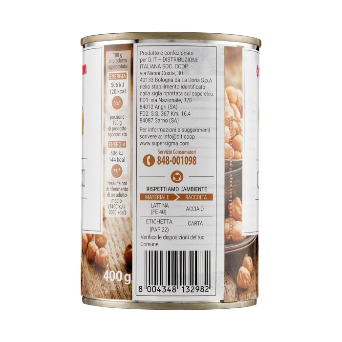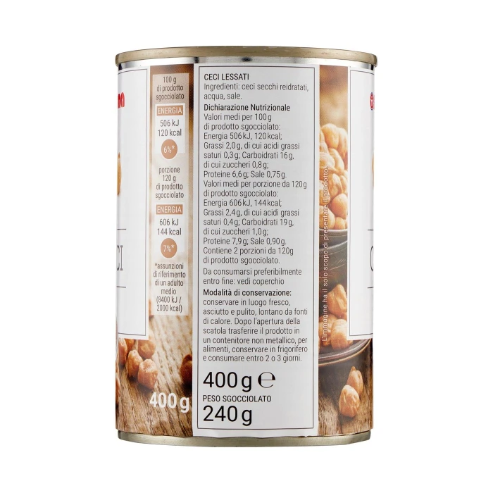 Per 100 g di prodotto - Energia: 506 kJ: 120 kcal, Grassi: 2,0 g, di cui acidi grassi saturi: 0,3 g, Carboidrati: 16 g, di cui zuccheri: 0,8 g, Proteine: 6,6 g, Sale: 0,75 g, Contiene 2 porzioni da 120g di prodotto sgocciolato