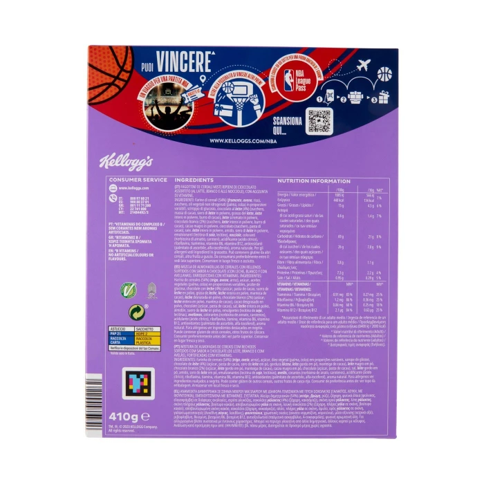 Farine di cereali (54%) (frumento, avena, riso), Zucchero, Oli vegetali non idrogenati (palma, girasole, colza) in proporzioni variabili, Sciroppo di glucosio, Cioccolato al latte (4%) (zucchero, massa di cacao, siero di latte in polvere, grasso del latte, latte intero in polvere, burro di cacao), Latte scremato in polvere, Cioccolato bianco (2%) (zucchero, latte intero in polvere, burro di cacao), Cacao magro in polvere, Cioccolato (zucchero, pasta di cacao), Sale, Latte intero in polvere, Amido modificato, Siero di latte in polvere, Emulsionante (lecitina di soia), Nocciole, Coloranti (norbissina di annatto, caroteni), Acido citrico, Antiossidanti (palmitato di ascorbile, alfa-tocoferolo), Aroma naturale, Riboflavina, Tiammina, Vitamina B6, Vitamina B12, Può contenere glutine da altri cereali, altra frutta a guscio