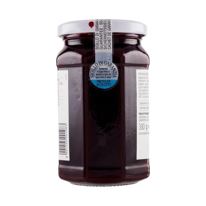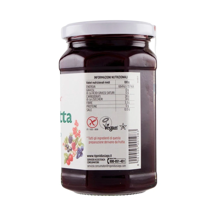 Frutti di bosco* 65% (in proporzione variabile: mirtilli neri*, fragole*, more di rovo*, mirtilli rossi*, ribes nero*, lamponi*, uva spina*, rosa canina*, cranberry*, ribes rosso*), Succo di mela concentrato*, Gelificante: pectina, *Biologico, Senza glutine