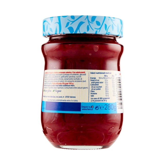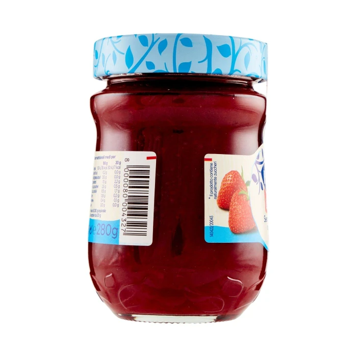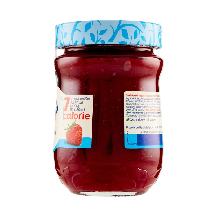 Fragole, Acqua, Edulcoranti (sciroppo di sorbitolo, glicosidi steviolici, sucralosio, acesulfame k), Gelificante (pectina), Succhi concentrati di amarena, aronia e limone, Conservante (sorbato di potassio), Stabilizzante (cloruro di calcio), Un consumo eccessivo può avere effetti lassativi, Frutta utilizzata: 50 g per 100 g