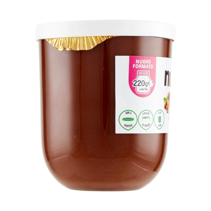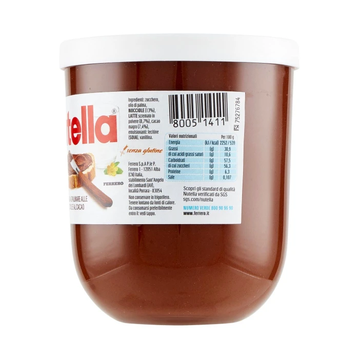 Zucchero, Olio di palma, Nocciole (13%), Latte scremato in polvere (8,7%), Cacao magro (7,4%), Emulsionanti: lecitine (soia), Vanillina, Senza glutine