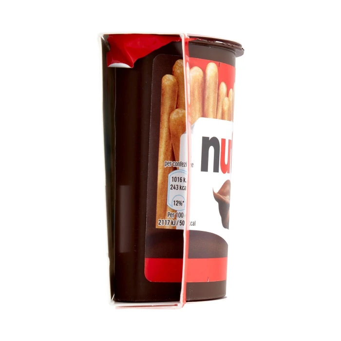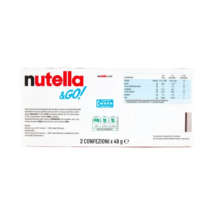 Per 100 g di prodotto - per 100 g: Energia : 2117 kJ / 506 kcal, grassi : 24,8 g, di cui: acidi grassi saturi : 9 g, carboidrati : 61,9 g, di cui: zuccheri : 42,5 g, proteine : 7,3 g, sale : 0,656 g, * Assunzioni di riferimento di un adulto medio (8400 kJ/2000kcal), ** Corrispondente a 35 g di Nutella e 13 g di biscotti salati per Confezione **: Energia : 1016 kJ / 243 kcal, grassi : 11,9 g, di cui: acidi grassi saturi : 4,3 g, carboidrati : 29,7 g, di cui: zuccheri : 20,4 g, proteine : 3,5 g, sale : 0,315 g, * Assunzioni di riferimento di un adulto medio (8400 kJ/2000kcal), ** Corrispondente a 35 g di Nutella e 13 g di biscotti salati %* per Confezione: Energia : 12, grassi : 17, di cui: acidi grassi saturi : 22, carboidrati : 11, di cui: zuccheri : 23, proteine : 7, sale : 5, * Assunzioni di riferimento di un adulto medio (8400 kJ/2000kcal), ** Corrispondente a 35 g di Nutella e 13 g di biscotti salati