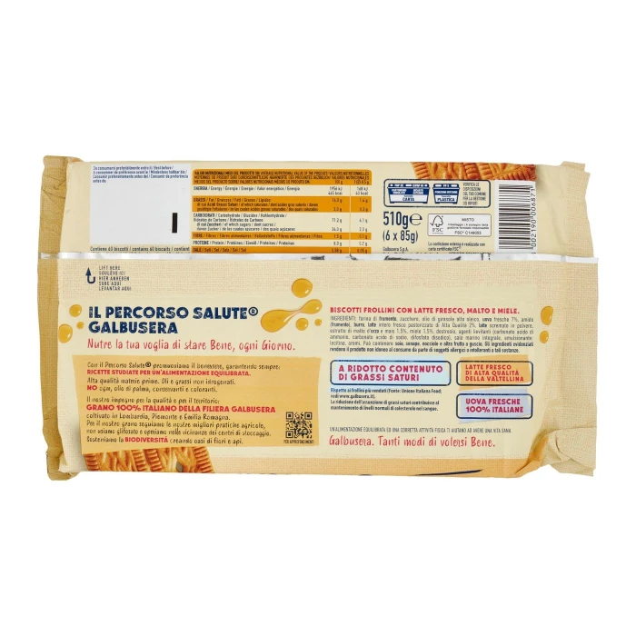 Farina di frumento, Zucchero, Olio di girasole alto oleico, Uova fresche 7%, Amido (frumento), Burro, Latte intero fresco pastorizzato di Alta Qualità 2%, Latte scremato in polvere, Estratto di malto d'orzo e mais 1,5%, Miele 1,5%, Destrosio, Agenti lievitanti (carbonato acido di ammonio, carbonato acido di sodio, difosfato disodico), Sale marino integrale, Emulsionante: lecitina, Aromi.
