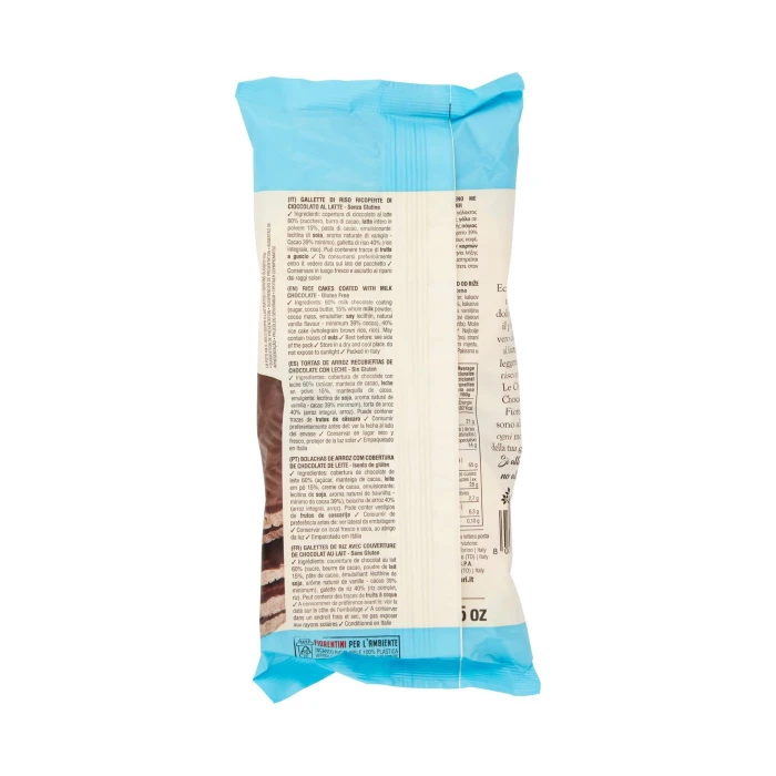 Copertura di cioccolato al latte 60% (zucchero, burro di cacao, latte intero in polvere 15%, pasta di cacao, emulsionante: lecitina di soia, aroma naturale vaniglia - cacao 39% minimo), Galletta di riso 40% (riso integrale, riso), Può contenere tracce di frutta a guscio