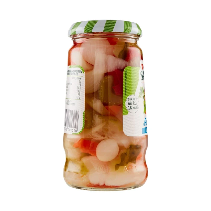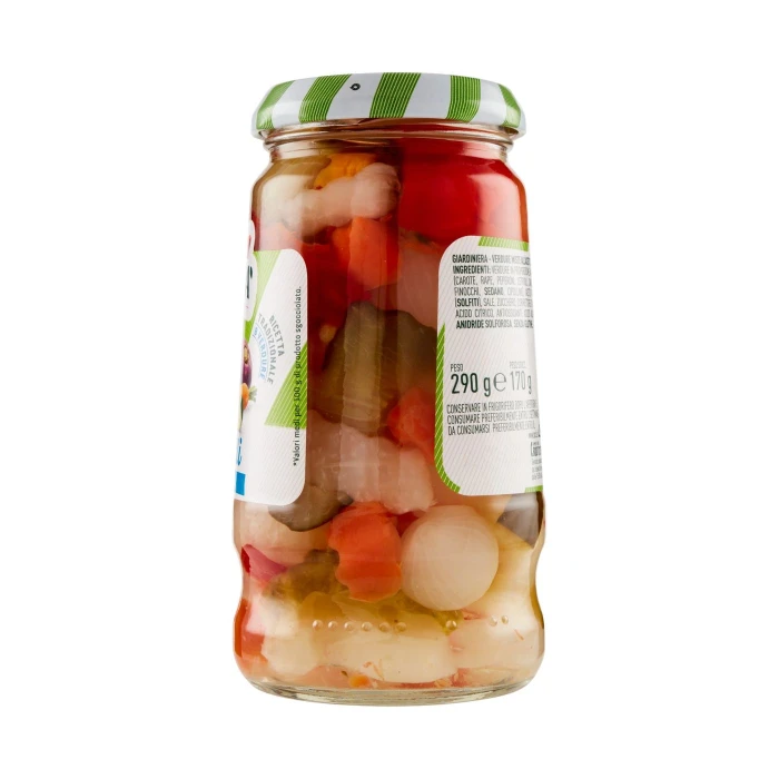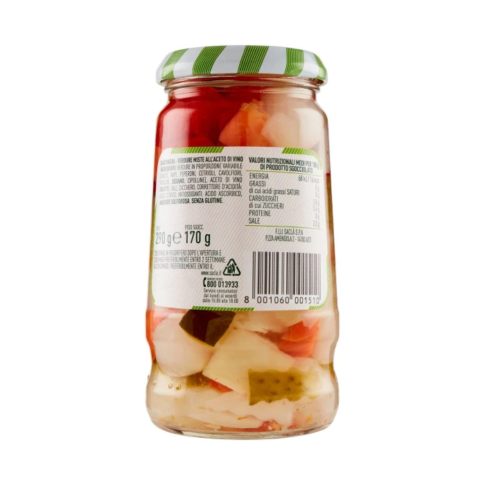 Verdure in proporzione variabile (carote, rape, peperoni, cetrioli, cavolfiori, finocchi, sedano, cipolline), Aceto di vino (solfiti), Sale, Zucchero, Correttore d'acidità: acido citrico, Antiossidanti: acido ascorbico, anidride solforosa, Senza glutine