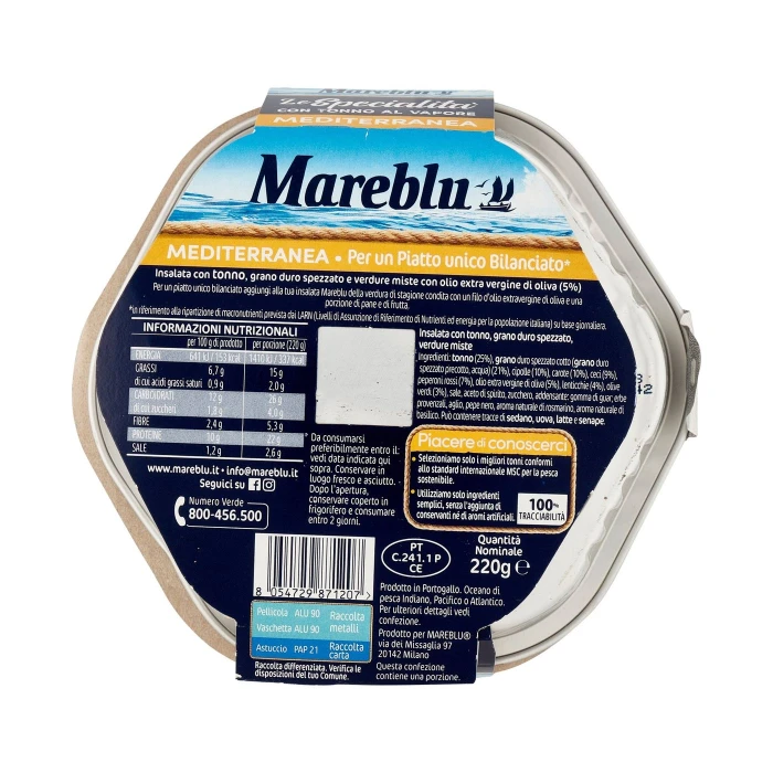 Tonno (25%), Grano duro spezzato cotto (grano duro spezzato precotto, acqua) (21%), Cipolle (10%), Carote (10%), Ceci (9%), Peperoni rossi (7%), Olio extra vergine di oliva (5%), Lenticchie (4%), Olive verdi (3%), Sale, Aceto di spirito, Zucchero, Addensante: gomma di guar, Erbe provenzali, Aglio, Pepe nero, Aroma naturale di rosmarino, Aroma naturale di basilico, Può contenere tracce di sedano, uova, latte e senape