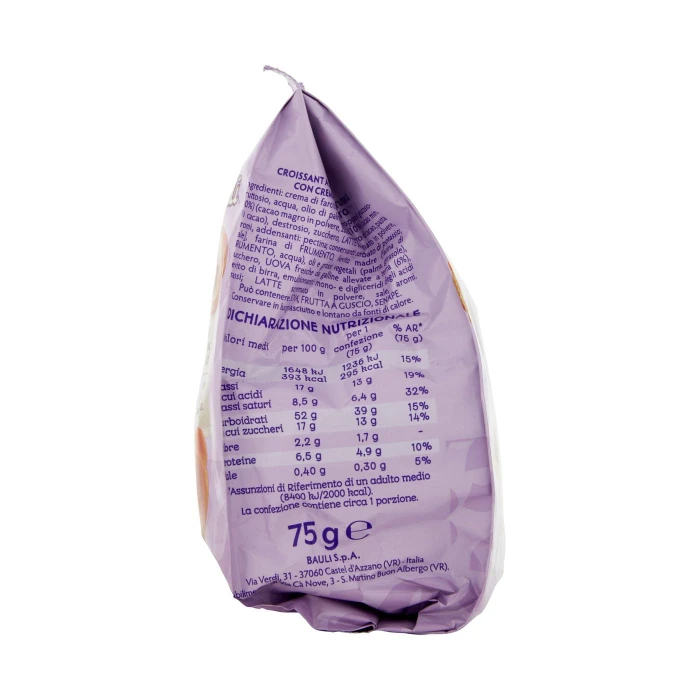 Per 100 g di prodotto - per 100 g: Energia: 1648 kJ, : 393 kcal, Grassi: 17 g, di cui acidi grassi saturi: 8,5 g, Carboidrati: 52 g, di cui zuccheri: 17 g, Fibre: 2,2 g, Proteine: 6,5 g, Sale: 0,40 g, *Assunzioni di Riferimento di un adulto medio (8400 kJ/2000 kcal), La confezione contiene circa 1 porzione per 1 confezione (75 g): Energia: 1236 kJ, : 295 kcal, Grassi: 13 g, di cui acidi grassi saturi: 6,4 g, Carboidrati: 39 g, di cui zuccheri: 13 g, Fibre: 1,7 g, Proteine: 4,9 g, Sale: 0,30 g, *Assunzioni di Riferimento di un adulto medio (8400 kJ/2000 kcal), La confezione contiene circa 1 porzione % AR* (75 g): Energia: 15%, , Grassi: 19%, di cui acidi grassi saturi: 32%, Carboidrati: 15%, di cui zuccheri: 14%, Fibre: -, Proteine: 10%, Sale: 5%, *Assunzioni di Riferimento di un adulto medio (8400 kJ/2000 kcal), La confezione contiene circa 1 porzione