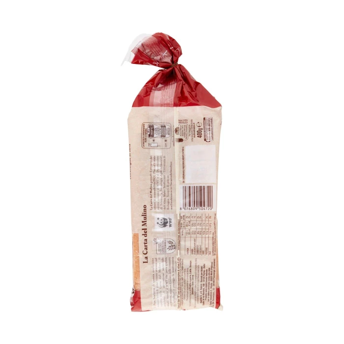 Per 100 g di prodotto - Per 100 g : Energia: 1132 kJ, : 268 kcal, Grassi: 3,2 g, di cui acidi grassi saturi: 0,6 g, Carboidrati: 49 g, di cui zuccheri: 9,0 g, Fibre: 4,5 g, Proteine: 8,5 g, Sale: 1,3 g, La confezione contiene 16 fette circa, *AR = assunzioni di riferimento di un adulto medio (8400 kJ / 2000 kcal) Per fetta (ca. 25 g): Energia: 283 kJ, : 67 kcal, Grassi: 0,8 g, di cui acidi grassi saturi: 0,2 g, Carboidrati: 12 g, di cui zuccheri: 2,3 g, Fibre: 1,1 g, Proteine: 2,1 g, Sale: 0,31 g, La confezione contiene 16 fette circa, *AR = assunzioni di riferimento di un adulto medio (8400 kJ / 2000 kcal) %AR* per fetta: Energia: 3%, : 3%, Grassi: 1%, di cui acidi grassi saturi: 1%, Carboidrati: 5%, di cui zuccheri: 3%, Fibre: -, Proteine: 4%, Sale: 5%, La confezione contiene 16 fette circa, *AR = assunzioni di riferimento di un adulto medio (8400 kJ / 2000 kcal)
