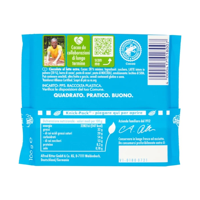Zucchero, Latte intero in polvere (20 %), Burro di cacao¹, Pasta di cacao¹, Pasta di nocciole, Emulsionante: lecitine di soia, Può contenere arachidi, altra frutta a guscio, cereali contenenti glutine e uova, ¹Rainforest Alliance Certified. Scopri di più su ra.org